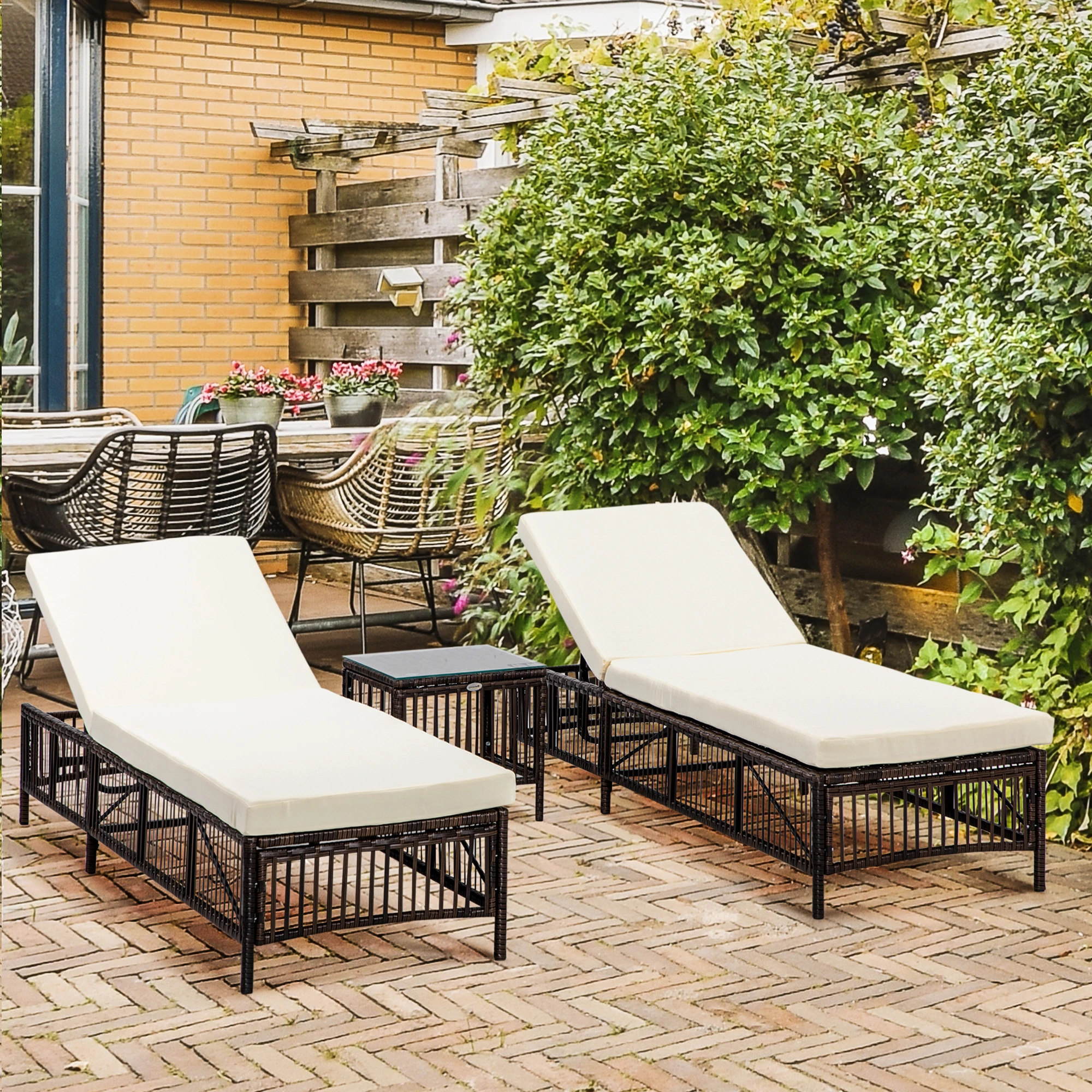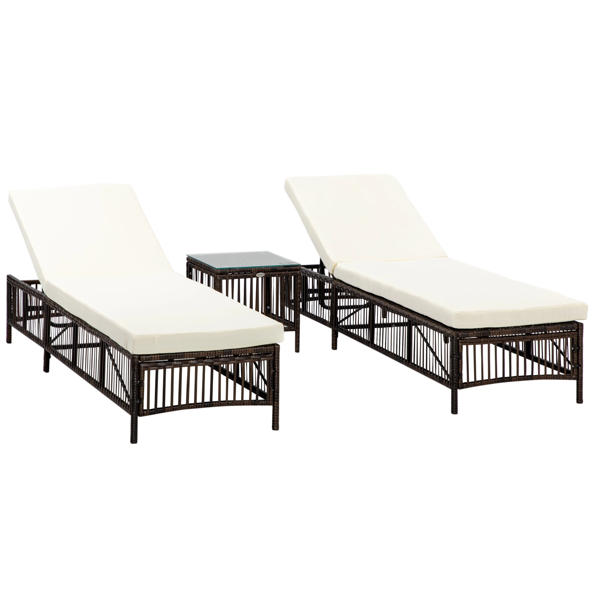 Set 2 Lettini Prendisole con Cuscini Imbottiti e Tavolino in Rattan PE, Marrone e Beige