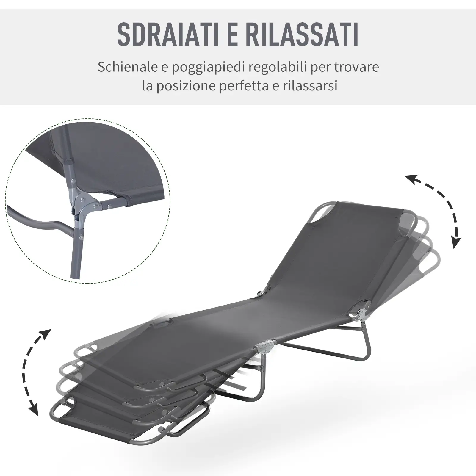 Vuoi portare il comfort in giro con te? Il lettino da giardino ti permetterà di prendere il sole in spiaggia, in campeggio o in piscina. La struttura è dotata di uno schienale reclinabile in 5 posizioni: scegli l'angolo di abbronzatura perfetto e goditi ogni momento del riposo estivo. Realizzata pensando all'ambiente esterno, la superficie in tessuto Oxford è in grado di affrontare ogni tipo di condizione, rendendola sufficientemente robusta per lunghi viaggi.