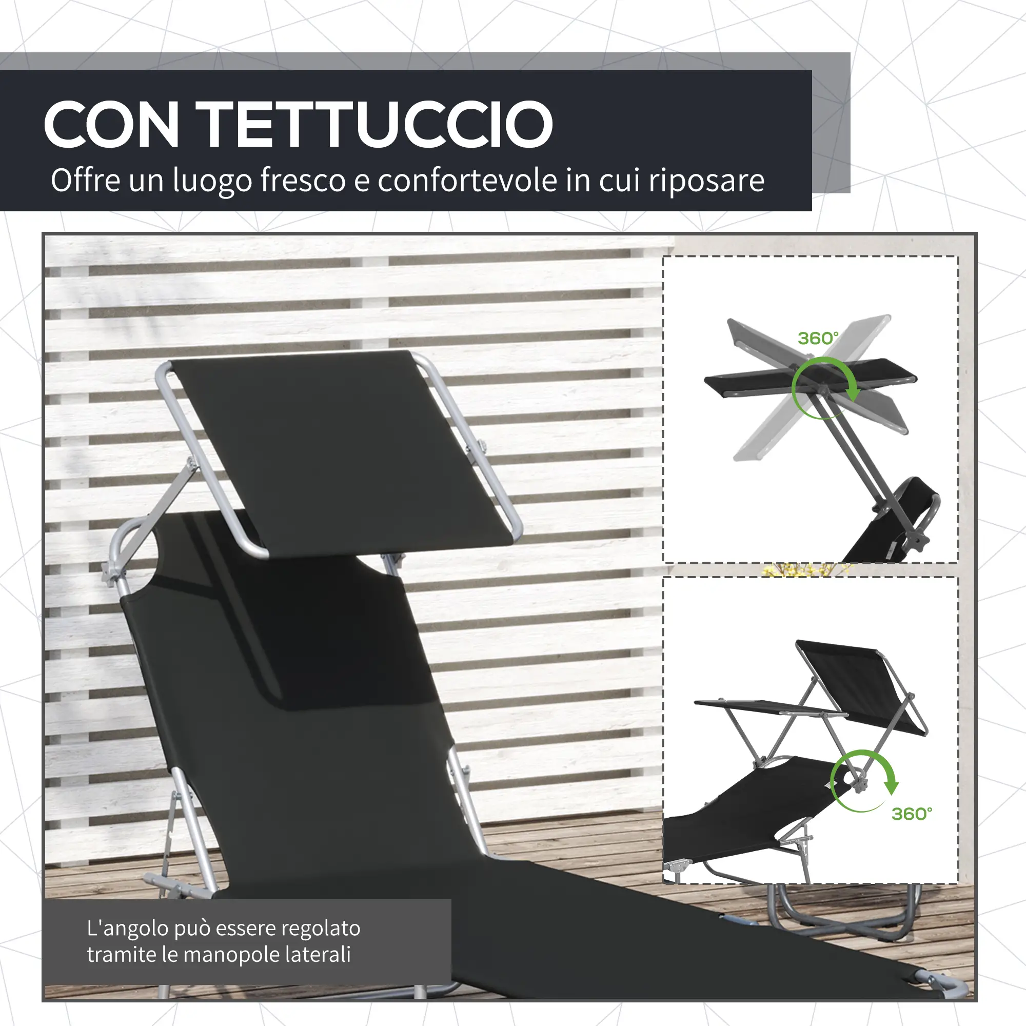 Lettino Prendisole da Giardino, Sdraio Pieghevole e Regolabile con Tettuccio in Tessuto Nero, 187x58x50cm