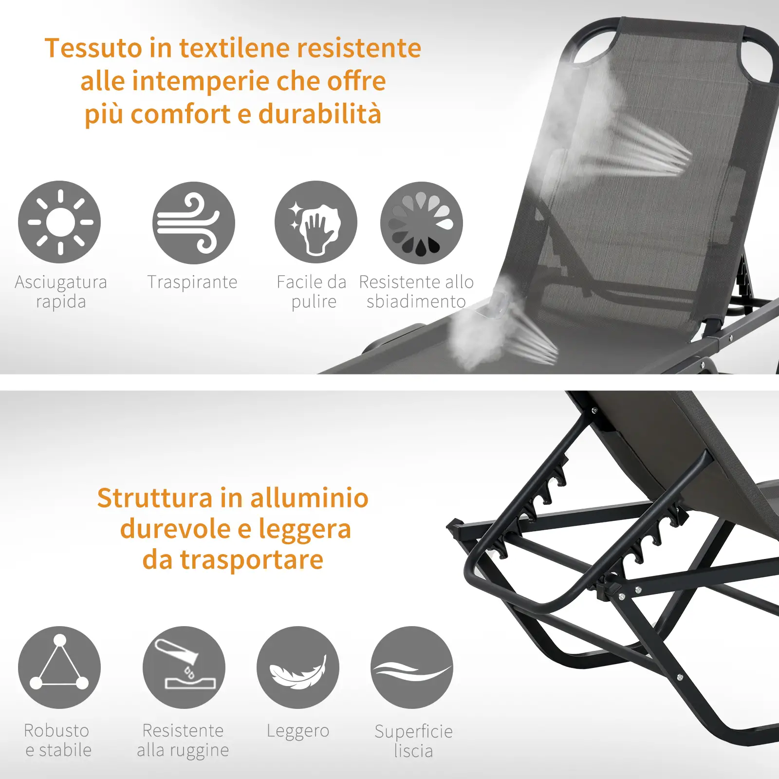 • Robusta struttura in tubolare di alluminio verniciato a polvere che rende la sdraio da giardino leggera e facile da spostare