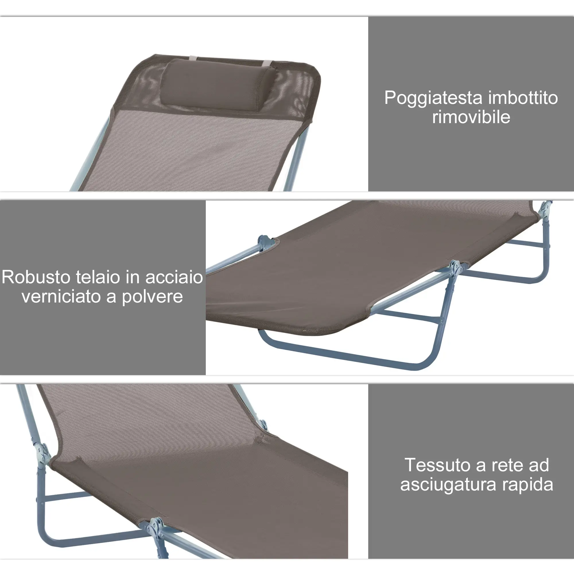 • Lettino in tessuto a rete traspirante, confortevole e con asciugatura rapida