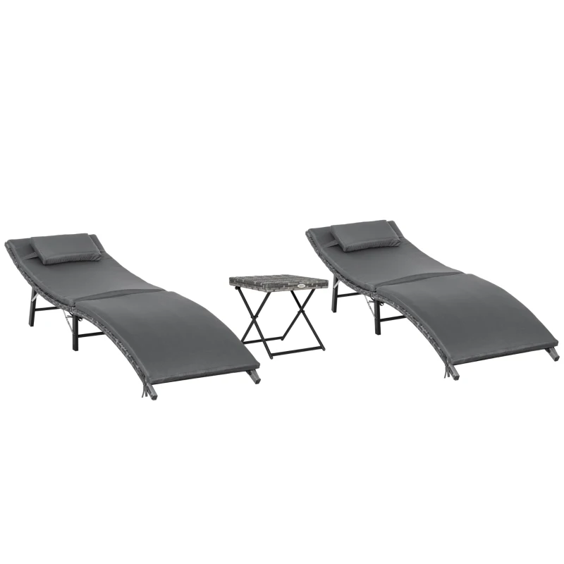 Lettini Prendisole Richiudibili con Cuscini Rimovibili e Tavolino Pieghevole, Set 3 Pz in Rattan, Grigio