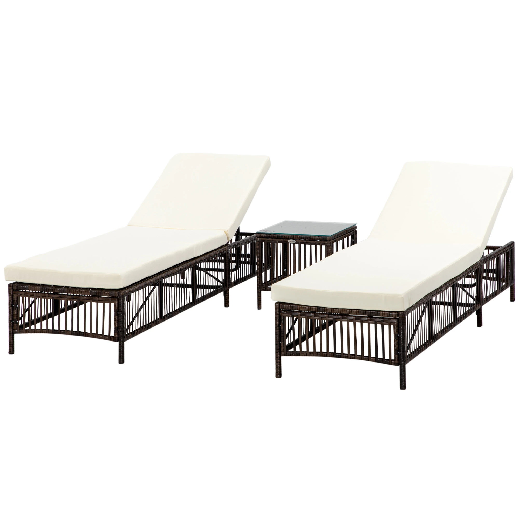 Set 2 Lettini Prendisole con Cuscini Imbottiti e Tavolino in Rattan PE, Marrone e Beige