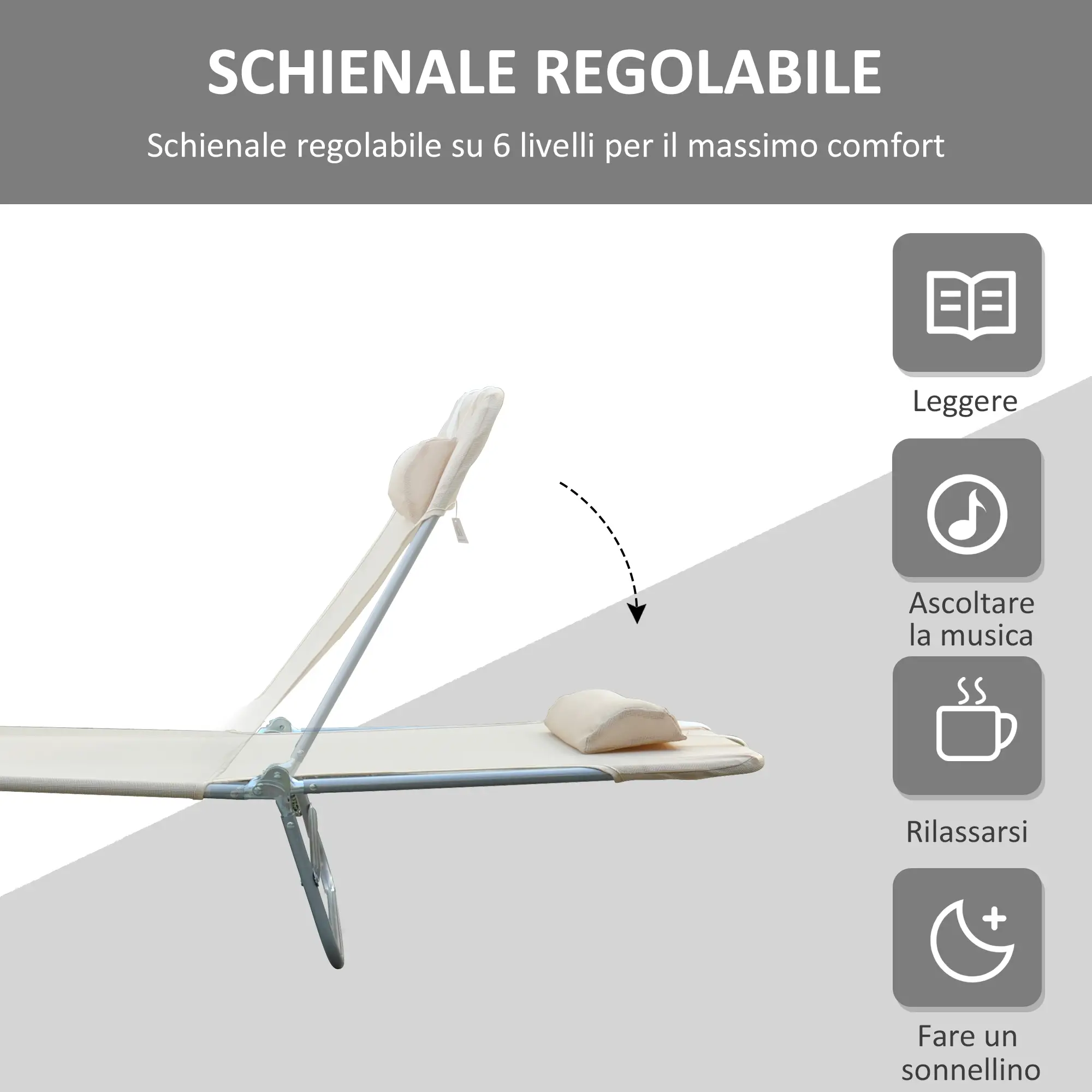 Immagina la scena: sole caldo, brezza leggera, tu e i tuoi amici che chiacchierate a bordo piscina o in giardino e vi godete il vostro tempo libero. A questo punto, un set di 2 lettini prendisole di è indispensabile. Lo schienale regolabile dotato di cuscino poggiatesta fornisce grande comfort e si adatta alle tue esigenze. I lettini possono essere facilmente piegati per risparmiare spazio e per un facile trasporto. Sceglili per i tuoi momenti di relax e nel tuo tempo libero!