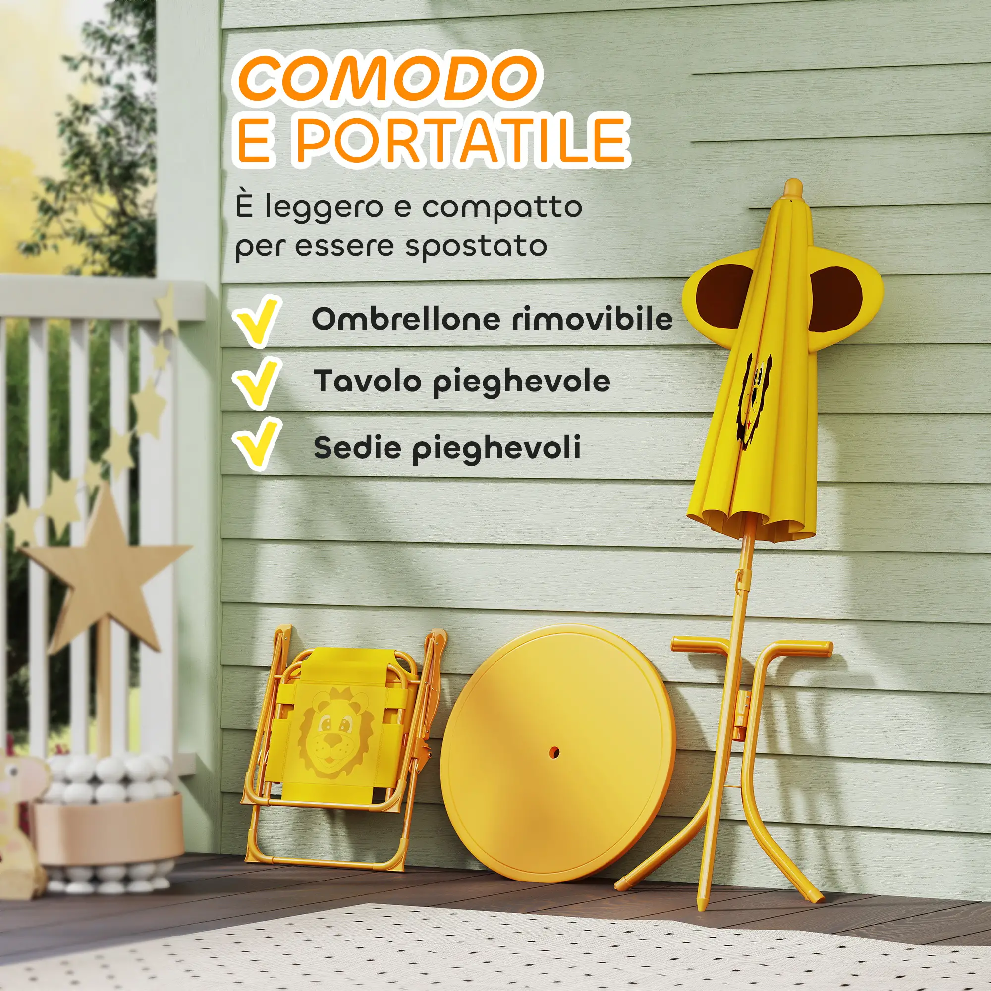 Rendi il tuo spazio esterno un centro di vivaci attività con il set da giardino per bambini . Con una divertente grafica con leoni, il set comprende due sedie pieghevoli per bambini, un tavolo rotondo e un ombrellone regolabile, perfetto per creare uno spazio confortevole all'aperto. Comodo da trasportare e riporre, è ideale per bambini di 2-5 anni per giocare al sole in tutta sicurezza.